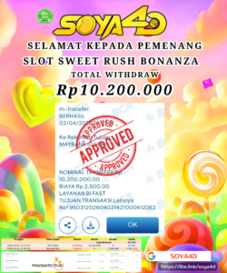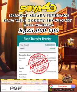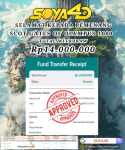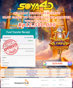 Selamat kepada Userid : KUL**** Telah berhasil mendapatkan kemenangan besar pada permainan SLOT GATES OF OLYMPUS SUPER SCATTER . Dengan kemenangan Sebesar Rp. 12.500.000.-. Setelah mengisi formulir withdraw dengan kurang waktu hanya 1 – 10 menit pihak SOYA4D sudah melakukan transfer kepada pemilik user id. Dan dana sudah masuk ke rekening id tersebut oleh pemenang. Bukti pembayaran yang kami berikan merupakan bukti pembayaran yang SAH / VALID yang langsung di dapatkan melalui tanda transfer transaksi berhasil dari Bank yang di tuju. Kami juga mengucapakan banyak Terima Kasih Kepada pemenang karena sudah mempercayakan kami sebagai Bandar Tepercaya yang membayar semua kemenangan member hingga lunas.