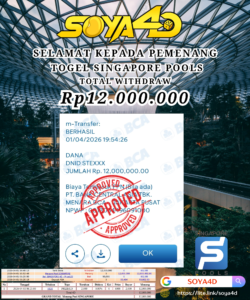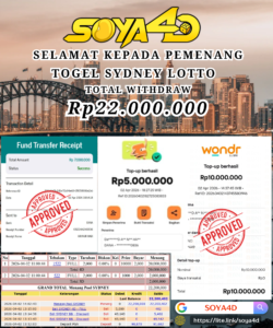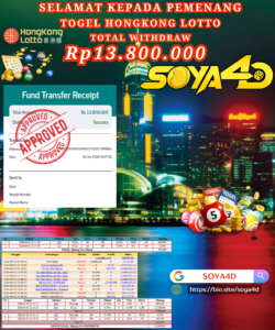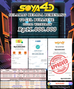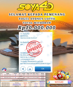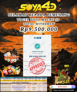 Selamat kepada Userid : HUB**** Telah berhasil mendapatkan kemenangan besar pada permainan TOGEL TOTO MACAU 4D . Dengan kemenangan Sebesar Rp. 10.100.000.-. Setelah mengisi formulir withdraw dengan kurang waktu hanya 1 – 10 menit pihak SOYA4D sudah melakukan transfer kepada pemilik user id. Dan dana sudah masuk ke rekening id tersebut oleh pemenang. Bukti pembayaran yang kami berikan merupakan bukti pembayaran yang SAH / VALID yang langsung di dapatkan melalui tanda transfer transaksi berhasil dari Bank yang di tuju. Kami juga mengucapakan banyak Terima Kasih Kepada pemenang karena sudah mempercayakan kami sebagai Bandar Tepercaya yang membayar semua kemenangan member hingga lunas.