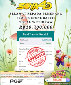 Selamat kepada Userid : TRI*** Telah berhasil mendapatkan kemenangan besar pada permainan SLOT FORTUNE RABBIT . Dengan kemenangan Sebesar Rp. 10.700.000.-. Setelah mengisi formulir withdraw dengan kurang waktu hanya 1 – 10 menit pihak SOYA4D sudah melakukan transfer kepada pemilik user id. Dan dana sudah masuk ke rekening id tersebut oleh pemenang. Bukti pembayaran yang kami berikan merupakan bukti pembayaran yang SAH / VALID yang langsung di dapatkan melalui tanda transfer transaksi berhasil dari Bank yang di tuju. Kami juga mengucapakan banyak Terima Kasih Kepada pemenang karena sudah mempercayakan kami sebagai Bandar Tepercaya yang membayar semua kemenangan member hingga lunas.