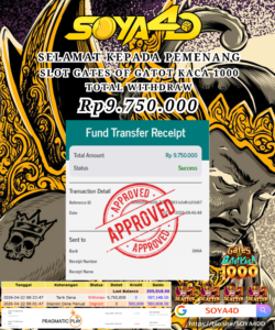 Selamat kepada Userid : PUN****** Telah berhasil mendapatkan kemenangan besar pada permainan SLOT GATES OF GATOT KACA 1000 Dengan kemenangan Sebesar Rp. 9.750.000.-. Setelah mengisi formulir withdraw dengan kurang waktu hanya 1 – 10 menit pihak SOYA4D  sudah melakukan transfer kepada pemilik user id. Dan dana sudah masuk ke rekening id tersebut oleh pemenang. Bukti pembayaran yang kami berikan merupakan bukti pembayaran yang SAH / VALID yang langsung di dapatkan melalui tanda transfer transaksi berhasil dari Bank yang di tuju. Kami juga mengucapakan banyak Terima Kasih Kepada pemenang karena sudah mempercayakan kami sebagai Bandar Tepercaya yang membayar semua kemenangan member hingga lunas.