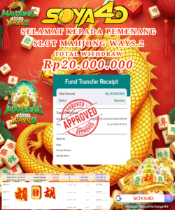 Selamat kepada Userid : LUW*** Telah berhasil mendapatkan kemenangan besar pada permainan SLOT MAHJONG WAYS 2 . Dengan kemenangan Sebesar Rp. 20.000.000.-. Setelah mengisi formulir withdraw dengan kurang waktu hanya 1 – 10 menit pihak SOYA4D sudah melakukan transfer kepada pemilik user id. Dan dana sudah masuk ke rekening id tersebut oleh pemenang. Bukti pembayaran yang kami berikan merupakan bukti pembayaran yang SAH / VALID yang langsung di dapatkan melalui tanda transfer transaksi berhasil dari Bank yang di tuju. Kami juga mengucapakan banyak Terima Kasih Kepada pemenang karena sudah mempercayakan kami sebagai Bandar Tepercaya yang membayar semua kemenangan member hingga lunas.