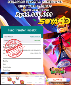 Selamat kepada Userid : WUD*** Telah berhasil mendapatkan kemenangan besar pada permainan SLOT WILD BANDITO . Dengan kemenangan Sebesar Rp. 11.000.000.-. Setelah mengisi formulir withdraw dengan kurang waktu hanya 1 – 10 menit pihak SOYA4D sudah melakukan transfer kepada pemilik user id. Dan dana sudah masuk ke rekening id tersebut oleh pemenang. Bukti pembayaran yang kami berikan merupakan bukti pembayaran yang SAH / VALID yang langsung di dapatkan melalui tanda transfer transaksi berhasil dari Bank yang di tuju. Kami juga mengucapakan banyak Terima Kasih Kepada pemenang karena sudah mempercayakan kami sebagai Bandar Tepercaya yang membayar semua kemenangan member hingga lunas.