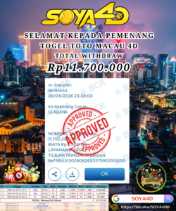 Selamat kepada Userid : EPA** Telah berhasil mendapatkan kemenangan besar pada permainan TOGEL TOTO MACAU 4D Dengan kemenangan Sebesar Rp. 11.700.000.-. Setelah mengisi formulir withdraw dengan kurang waktu hanya 1 – 10 menit pihak SOYA4D  sudah melakukan transfer kepada pemilik user id. Dan dana sudah masuk ke rekening id tersebut oleh pemenang. Bukti pembayaran yang kami berikan merupakan bukti pembayaran yang SAH / VALID yang langsung di dapatkan melalui tanda transfer transaksi berhasil dari Bank yang di tuju. Kami juga mengucapakan banyak Terima Kasih Kepada pemenang karena sudah mempercayakan kami sebagai Bandar Tepercaya yang membayar semua kemenangan member hingga lunas.